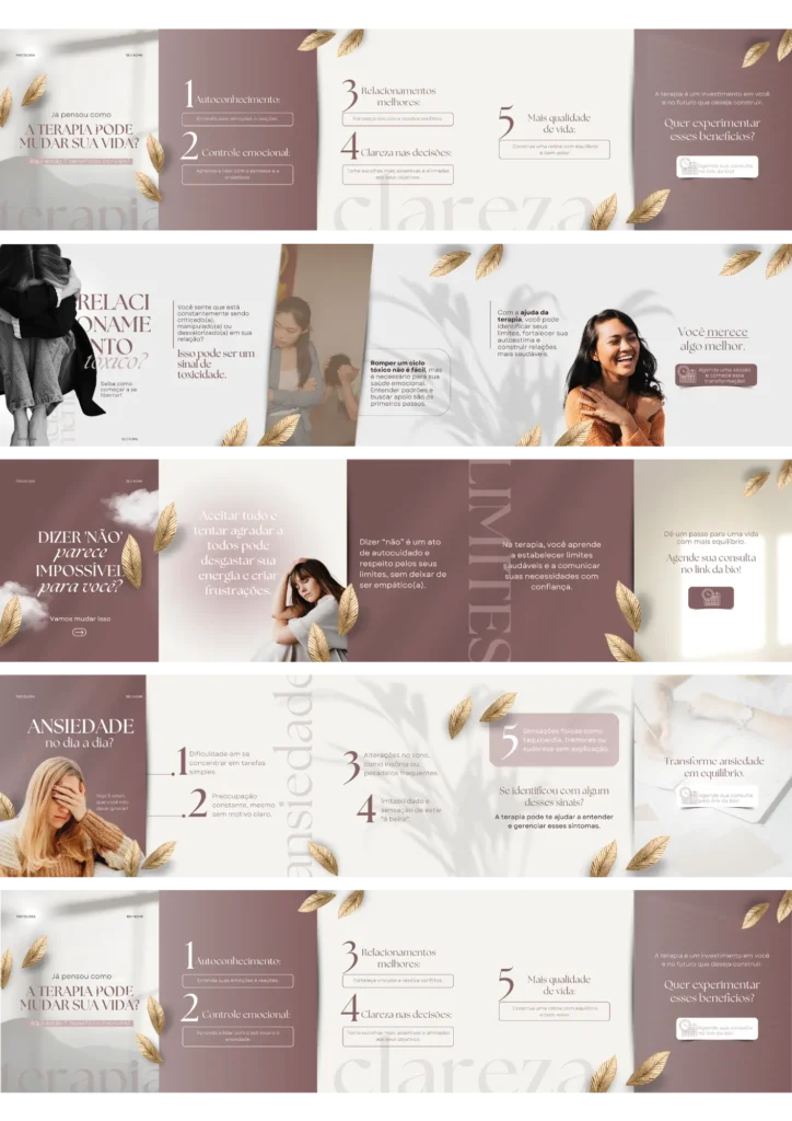 Carrosséis com conteúdo e legenda estratégicos que posicionam você como referência e direcionam para o agendamento de consultas.